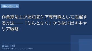 認知症病棟や老健で働くOTが、専門性を意識的に積み上げ「認知症ケア専門職」として活躍するための具体的なキャリア戦略を解説します。認知症ケア専門士の取得から、BPSD対応・環境調整・地域連携まで。